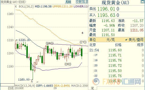 汇通财经易汇通软件显示,北京时间22:14,现货黄金报1197.82美元/盎司。