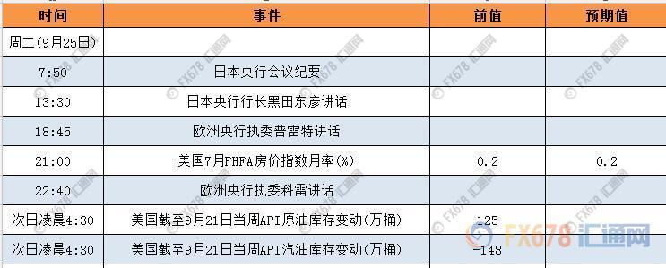 周二(9月25日)关键词:日本央行会议纪要;欧洲央行官员讲话;