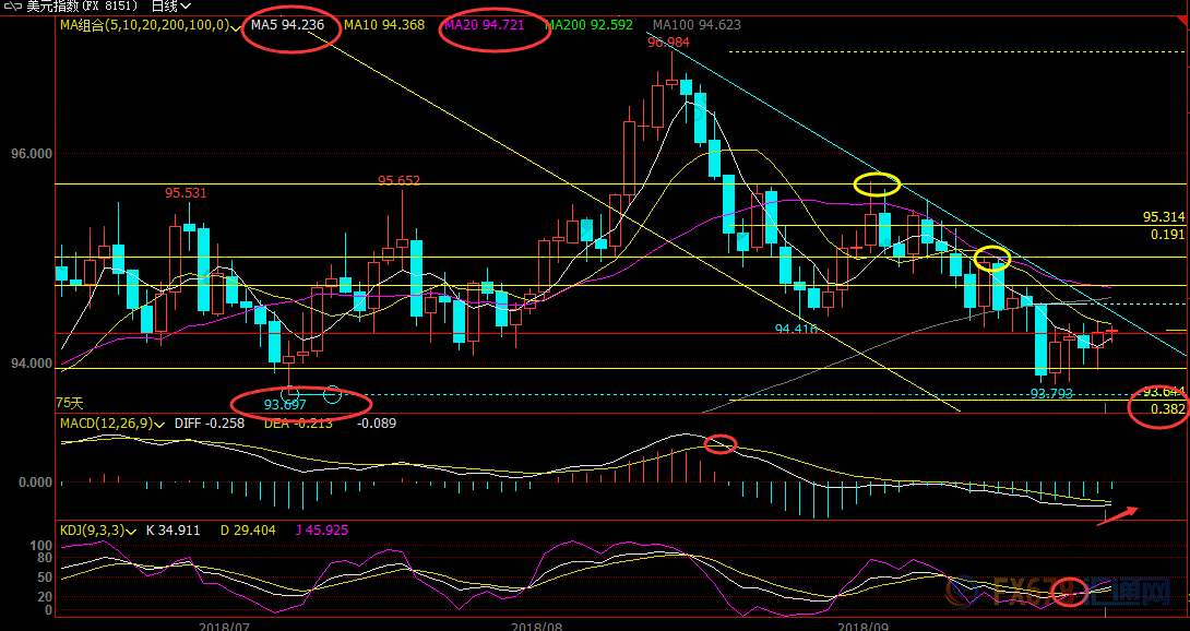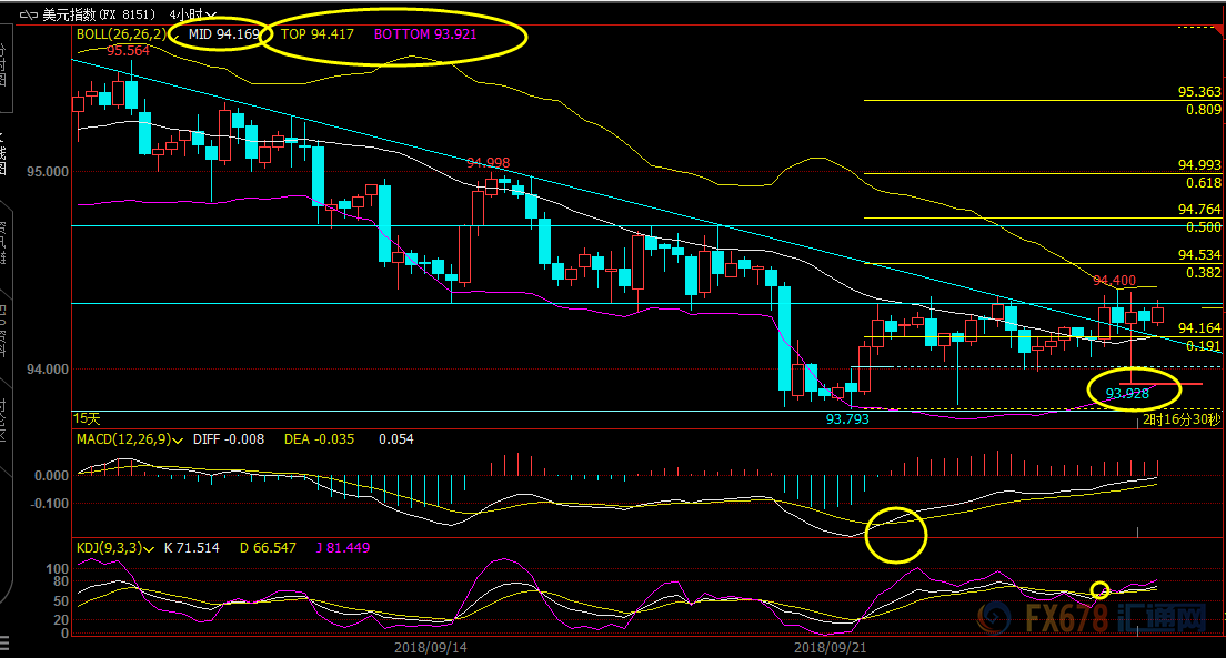 下方布林线中轨支撑在94.17附近;布林线下轨和隔夜低点支撑都在93.92附近,如果意外下破,则增加下行风险。