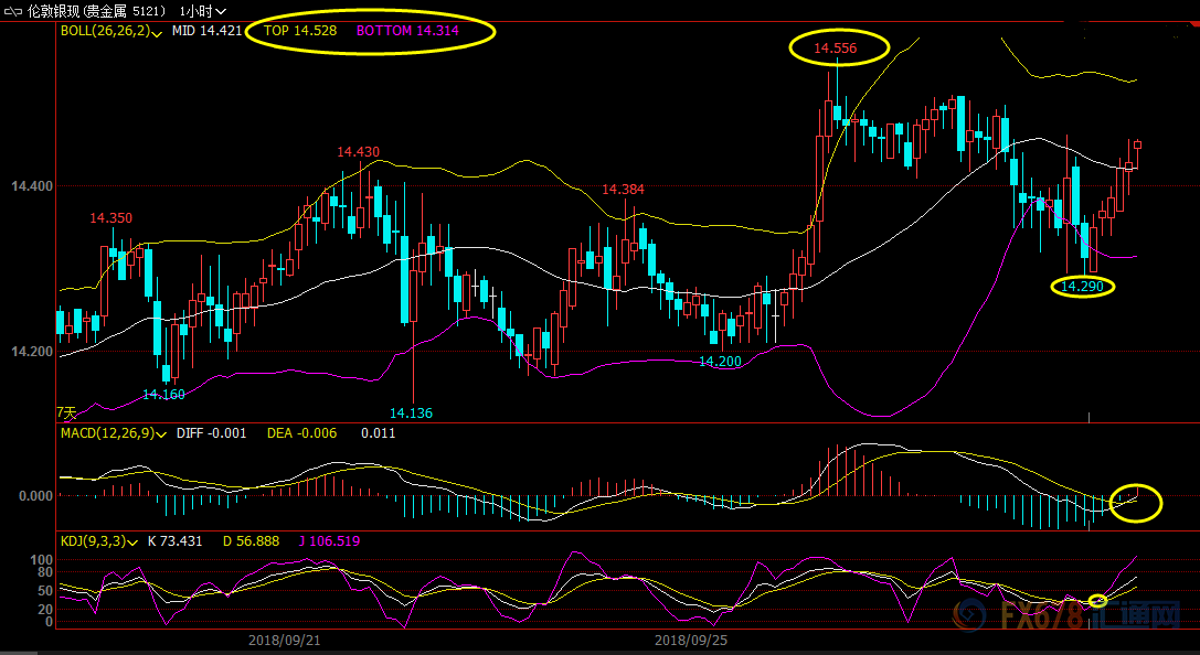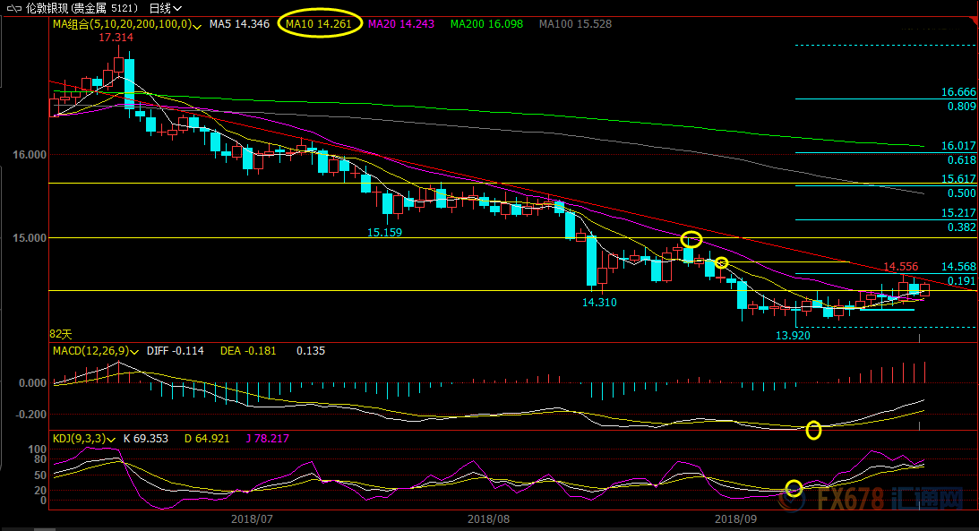 下方初步支撑在10均线14.24附近,如果银价未能顶破14.57阻力,并回落至14.24下方,则削弱短线看涨信号;然后14.14和14.00附近也还分别存在一些支撑;9月11日低点支撑在13.92附近。