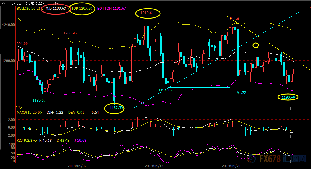 上方初步阻力在布林线中轨1199.64附近,本周高点阻力子啊1204.10附近,布林线上轨阻力在1210.52附近,若意外顶破该位置,则增加看涨信号。