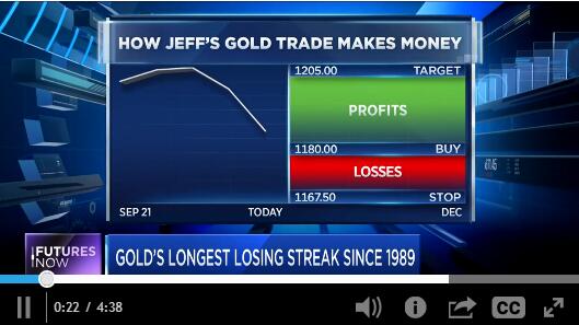 不过,尽管黄金正处于近30年来最长的连跌轨道上,但CNBC旗下“Futures Now”栏目交易员Jeff Kilburg却依然表示,黄金多头可能会卷土重来。