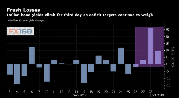 (意大利债券收益率走势,来源:彭博,FX168财经网)