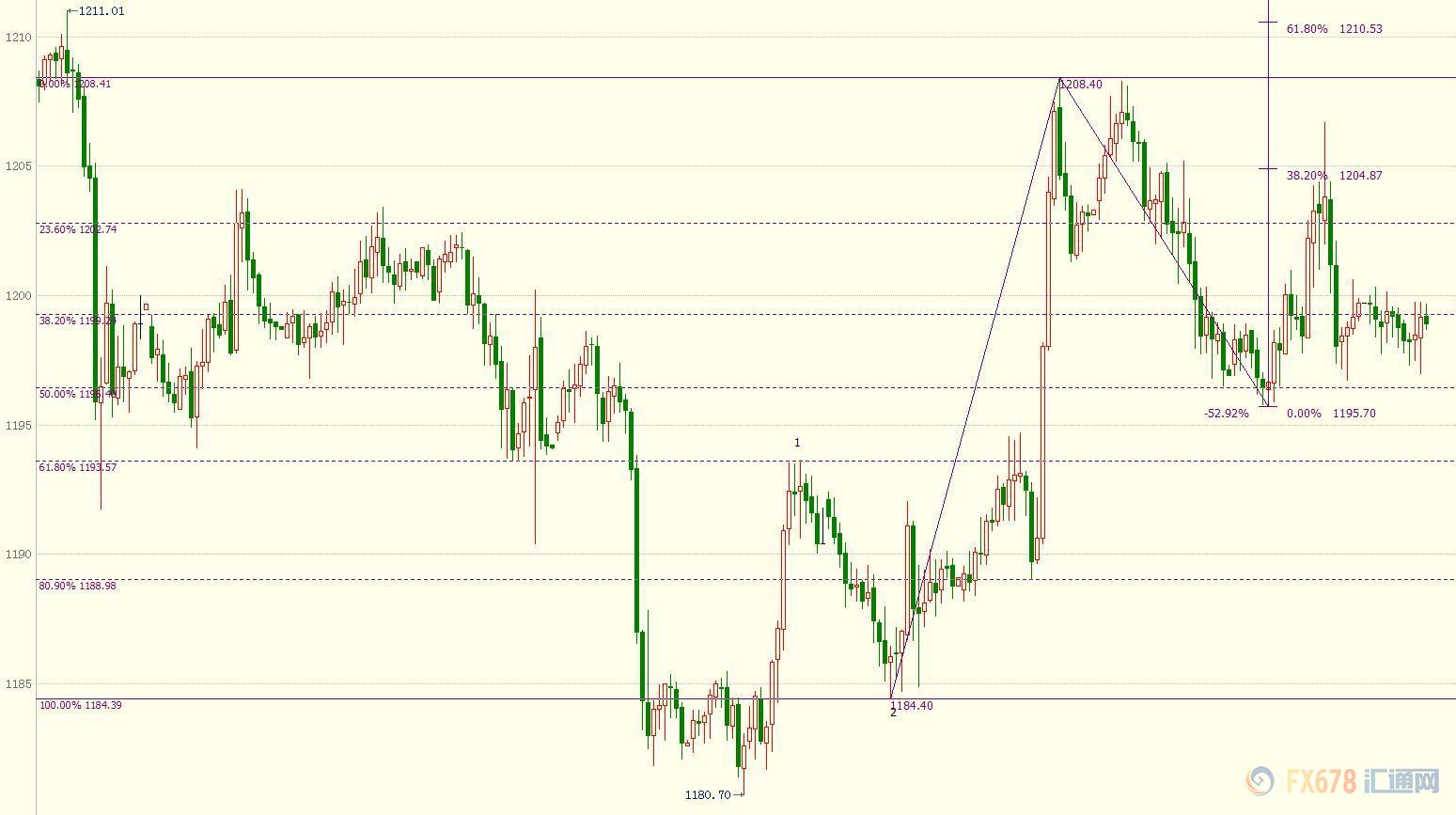 因为若将1195.70美元视为上行5浪的起点,上个交易日金价在短时上破1204.87美元,即38.2%目标位后便迅速回落,甚至一度逼近1195.70美元。