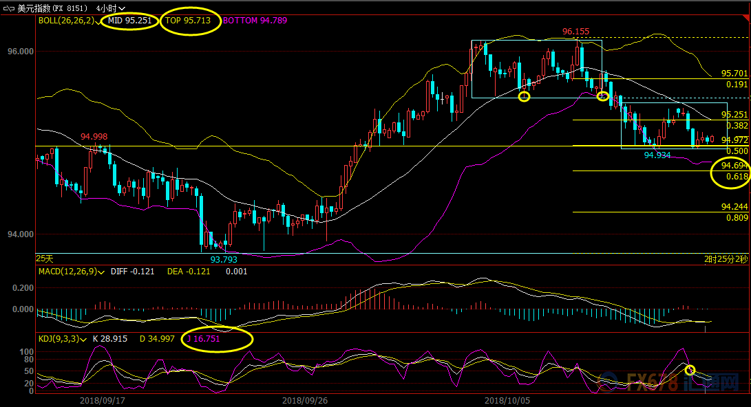 上方布林线中轨阻力在95.25附近,若升破该位置,则削弱看空信号;进一步阻力在95.50附近,布林线上轨阻力在95.71附近。