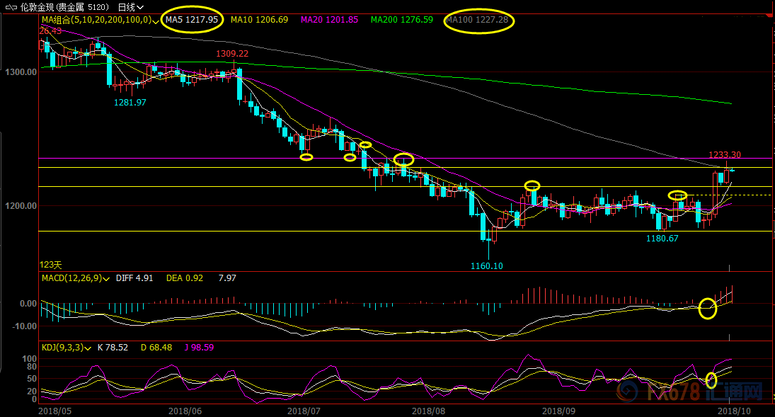 下方初步支撑在5日均线1217.95附近,8月28日高点支撑在1214.25附近,若意外失守该位置,则削弱看涨信号;10月2日高点支撑在1208.50附近。