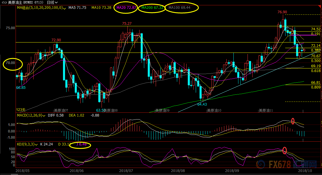 上方初步阻力在20日均线72.87附近,若意外顶破该位置,则削弱看空信号;10月9日低点阻力在74.00附近。