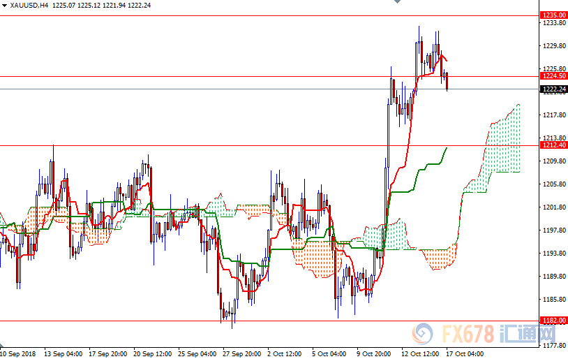 短周期图上看,金价日内上破1小时图上云区——1224.50-1226.40美元一带,如果金价能站上1226.40美元,重心将进一步上抬至1235-1240美元,那里有前期下跌空间(1365-1160美元)的38.2%斐波那契回档位1238.50美元。