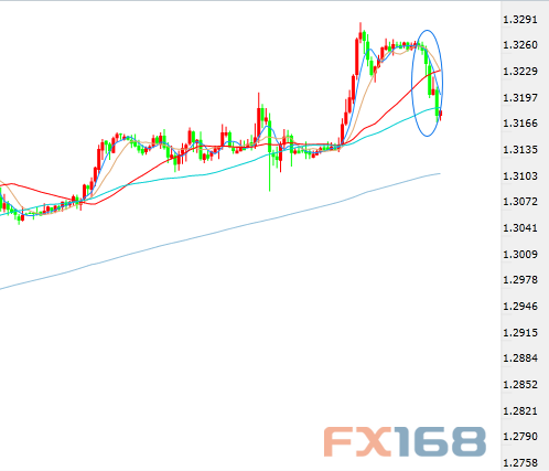 小时级别,汇价欧盘自高点1.3276一线持续走低,截至发稿,最低触及1.3177一线,跌幅近100点。