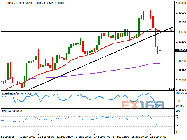 技术指标自超买水平大幅回撤,目前直线走低,但位于中线上方。20日均线失去方向,目前持平在1.3020附近。9月14日低点位于1.3056,该水平对汇价构成短期支持。