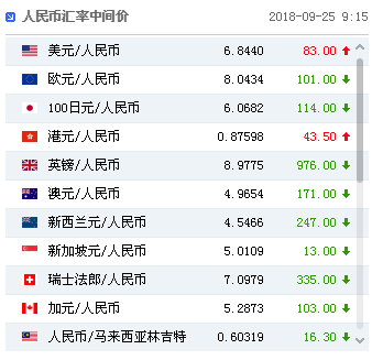 新浪财经讯 9月25日,人民币兑美元中间价报6.8440,下调83点。上一交易日中间价6.8357。