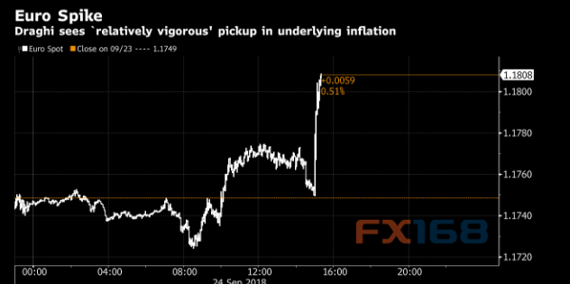 FX168财经报社(香港)讯 作为周一日内最受关注的事件,欧洲央行行长德拉基的讲话果然引发市场的波动。德拉基在最新的讲话中意外发出鹰派声音,欧元因此一度跳升,而美元遭遇打击;不过投资者对贸易紧张局势的忧虑令美元反弹,欧元/美元回吐涨幅。此外,因美国国务卿蓬佩奥表示美国牧师可能本月获释,土耳其里拉周一出现大涨。