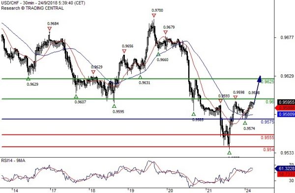 交易策略:于0.9575上方做多,目标看至0.9600和0.9625;而如果汇价跌破0.9575,则将进一步下跌,目标看至0.9555和0.9540。