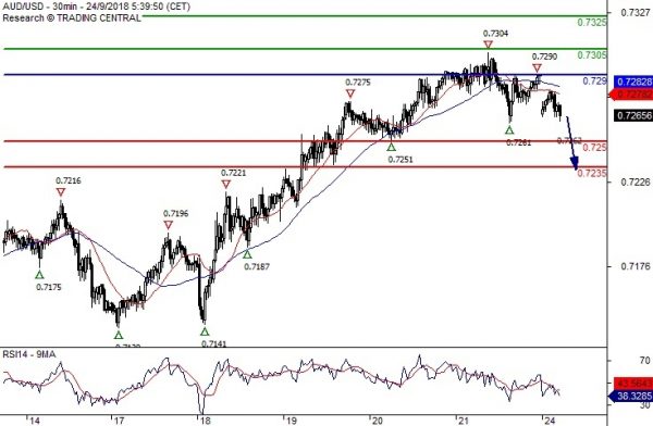 交易策略:于0.7290下方做空,目标看至0.7250和0.7235;而如果汇价突破0.7290,则将进一步上涨,目标看至0.7305和0.7325。