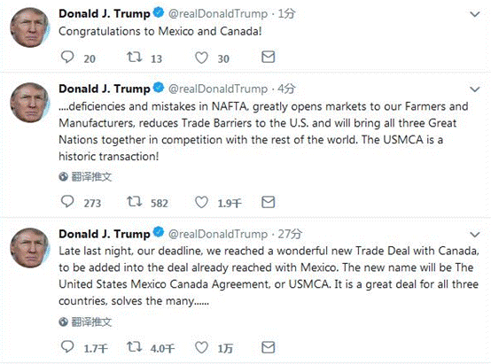 除了发表声明之外,特朗普还发推盛赞与加墨两国达成了历史性新协议,还特别恭喜了两国。前一天,加拿大和美国已就北美自由贸易协定框架达成一致意见。