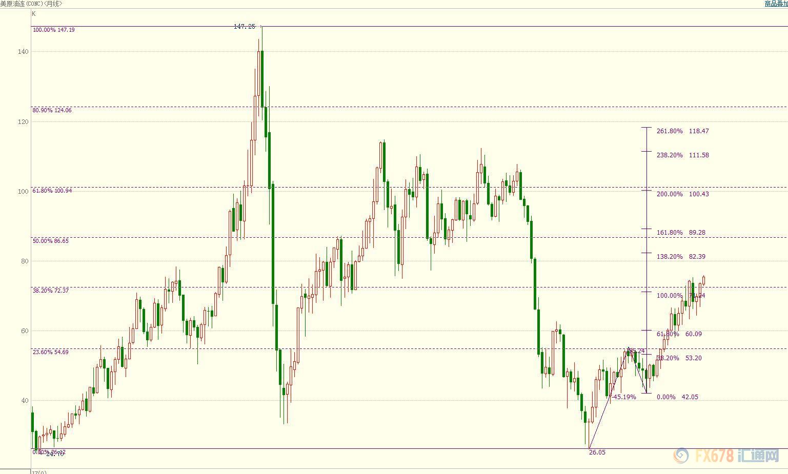 美国原油今年底前可能升至每桶80-86.66美元区间,因其已攻克阻力位72.36美元。该阻力位是从2008年高位147.27跌至26.05跌势的38.2%回档位。