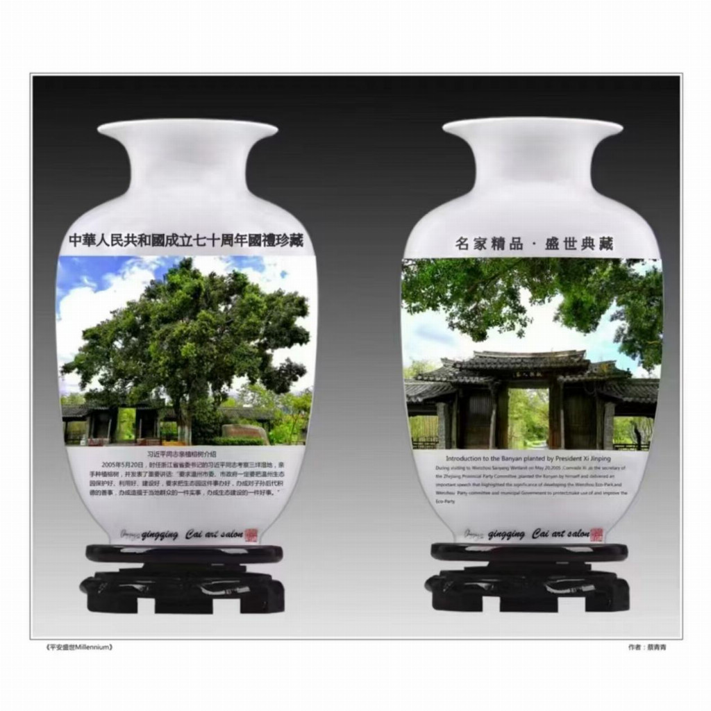 《平安盛世》此作品中的树,是2005年习进平同志考察温州三垟湿地亲植的一棵小叶榕树。创作于2019年8月,为庆祝中华人民共和国成立70周年,与景瓷完美结合,特制成寓为:平安盛世作品。