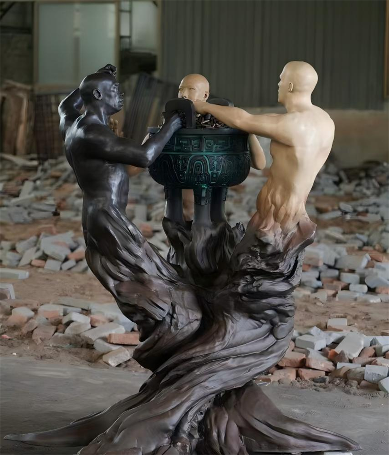 雕塑以“欧亚非三个人种争夺鼎”为核心形态。鼎,在中国古代便是权力的象征,是无数纷争的缘起;雕塑上半身,三人呈激烈争夺之势,肌肉紧绷、姿态焦灼,恰是人类为私欲兵戎相向的生动写照。而在这剑拔弩张的姿态之下,却是紧紧相连、盘根错节的树根——这是艺术家埋下的深刻隐喻:无论肤色、种族、地域,人类本就同根同源,命运休戚与共。